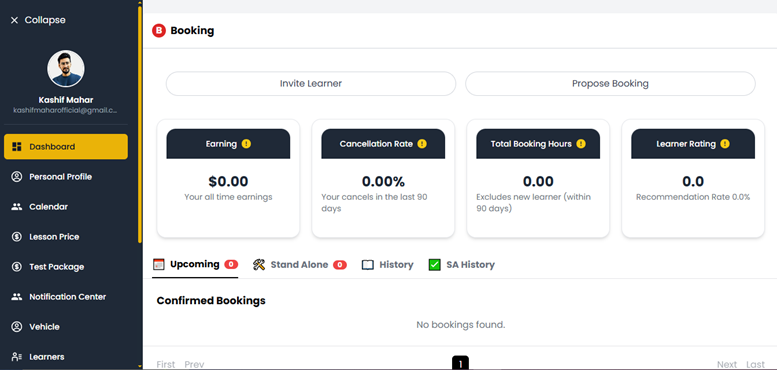 Here, you’ll be able to view and manage all your bookings, check your lesson schedule, track your earnings, and update your availability anytime.