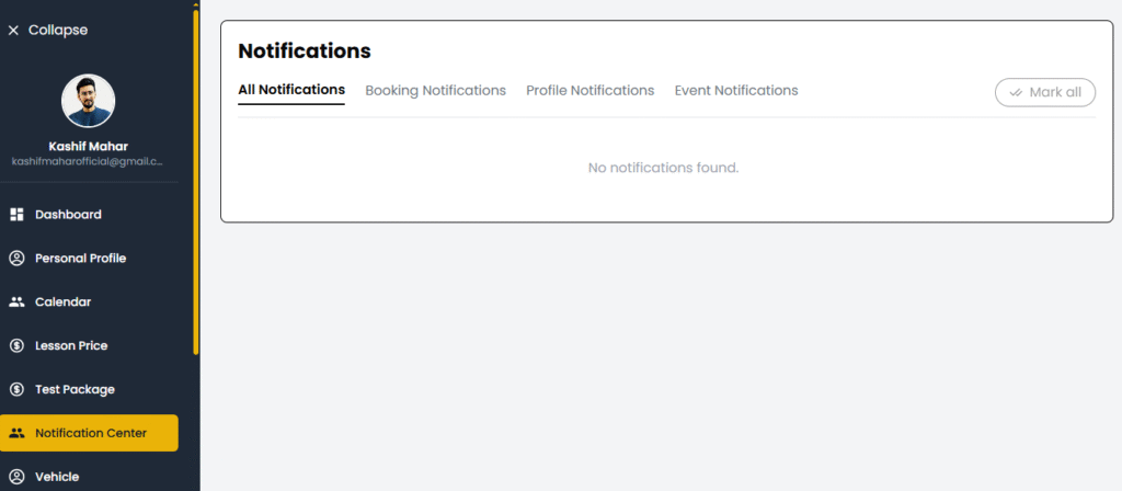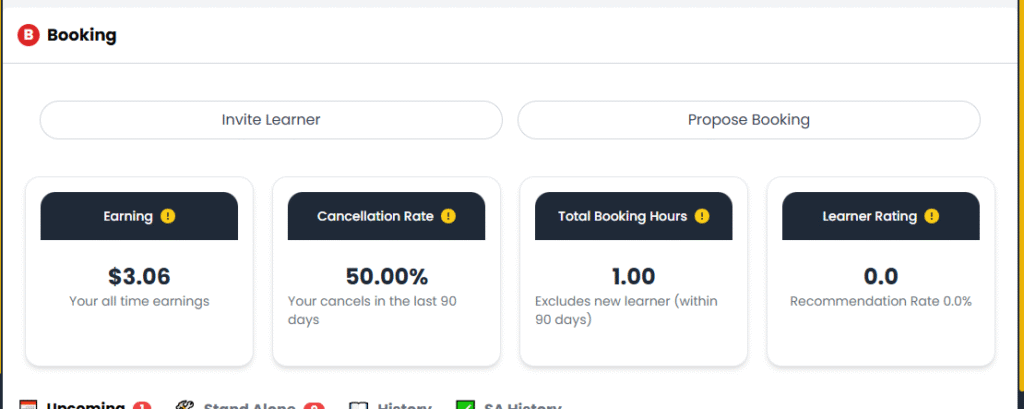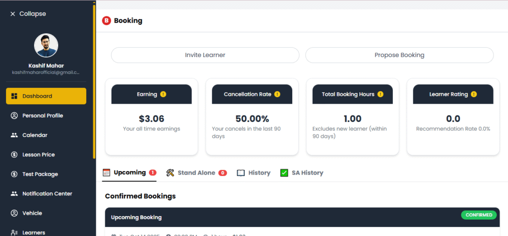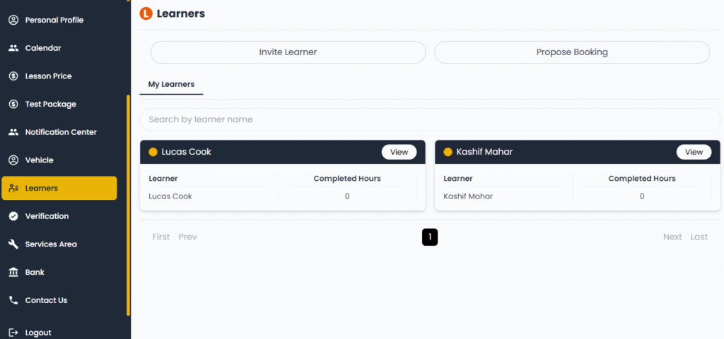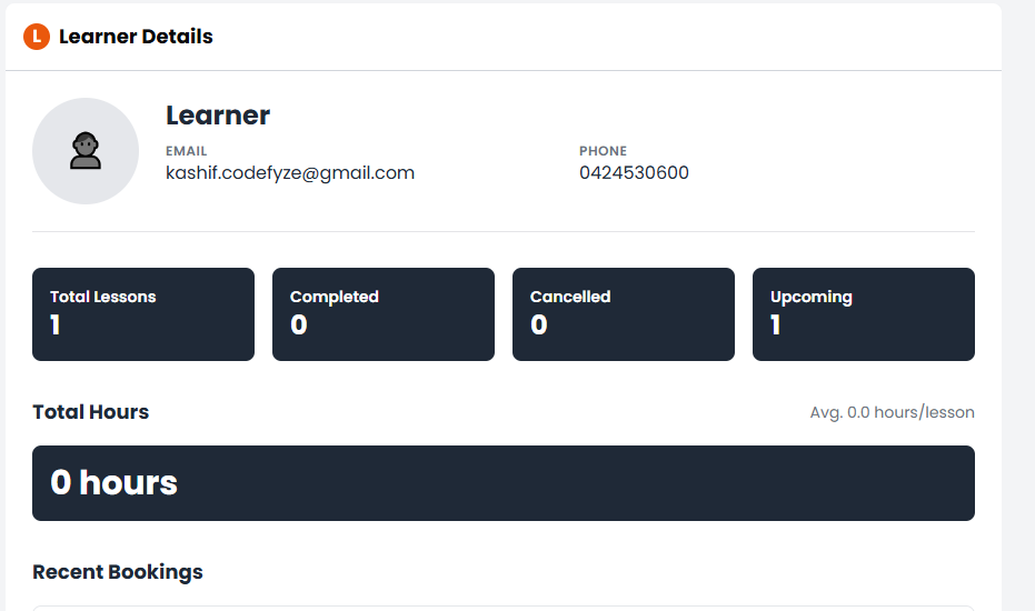 This section allows you to view all learners who have booked lessons with you. It gives you detailed insight into their booking status and lesson history.
