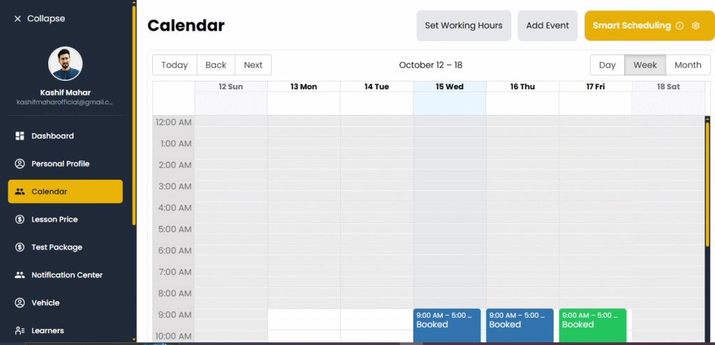- Learners can only book lessons within your available time slots.