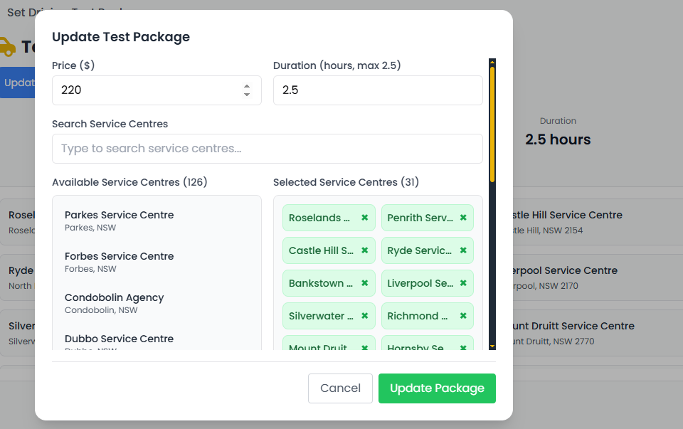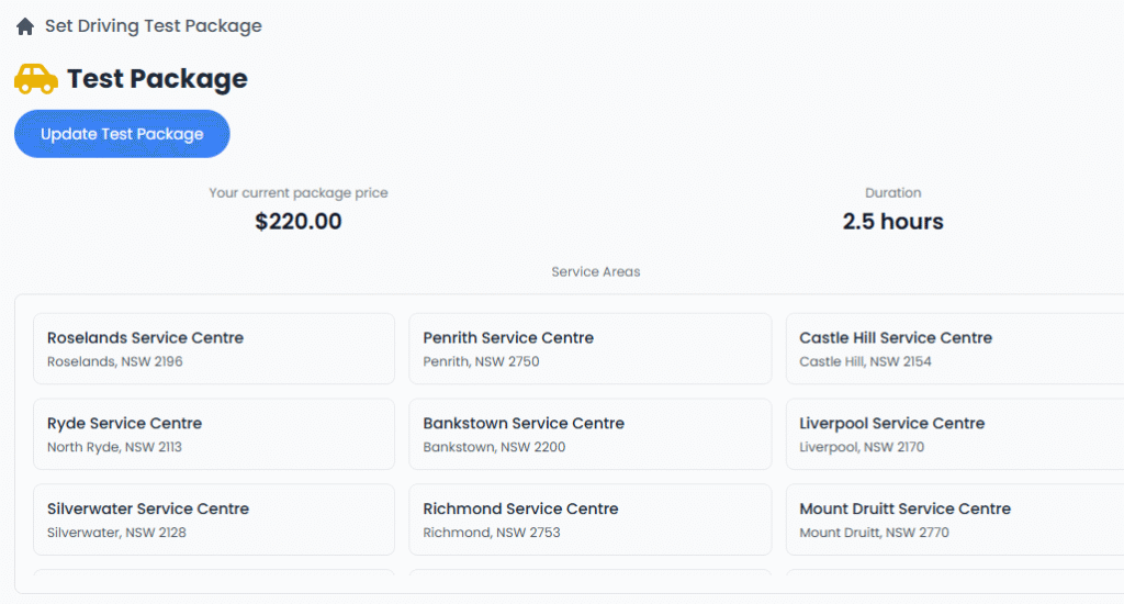 Example:2.5 hours - Service Areas: A list of RMS (Service NSW) centres where you’re available to offer this service.