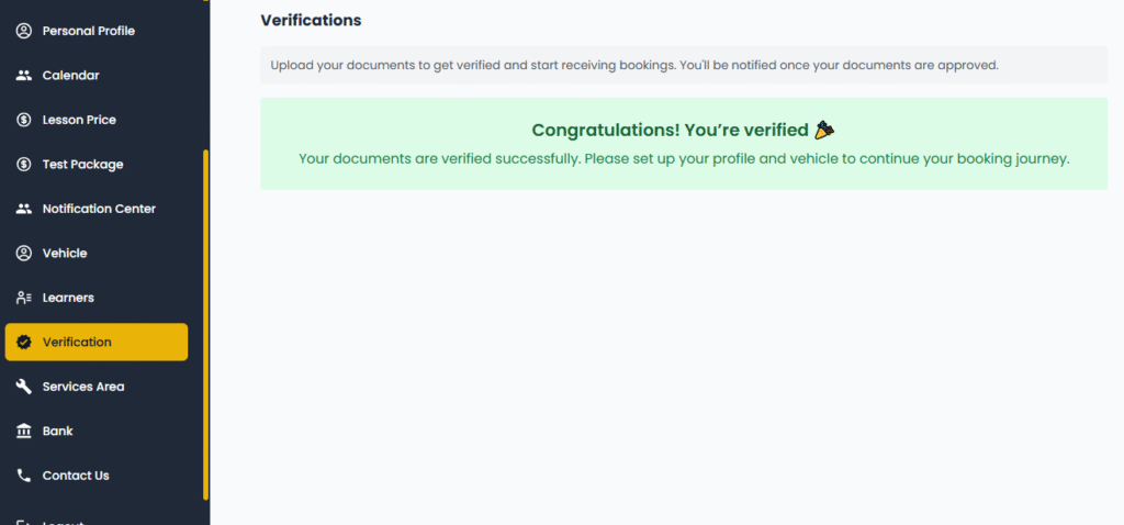 Your documents are verified successfully. Please set up your profile and vehicle to continue your booking journey.