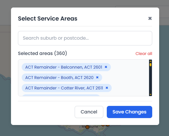 - A new popup window will appear where you can manage your selected suburbs.
