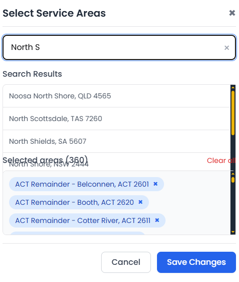 Once the Edit Service Areas popup opens: