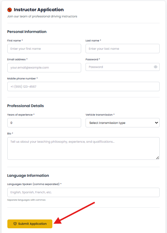 Then Instructor Application page will open and you need to enter your full name, email, password, mobile number, your years of experience, vehicle transmission type, add your bio and add language information. Then Click Submit.