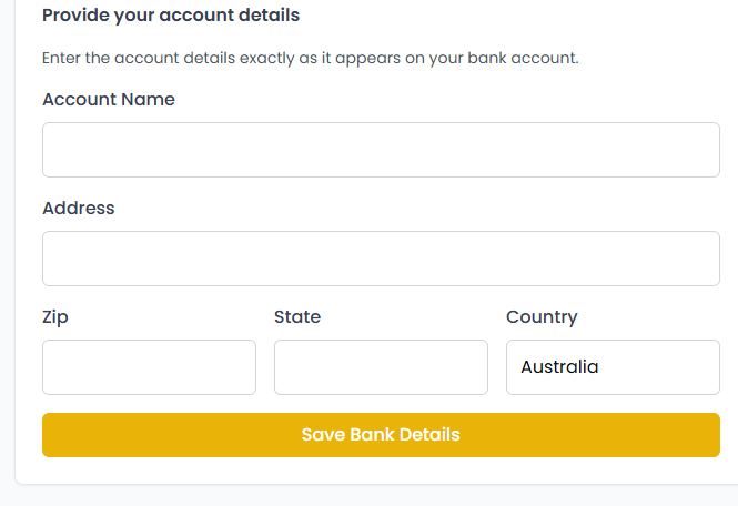 Enter your Bank Name, Account Name, BSB/Sort Code, and Account Number.
