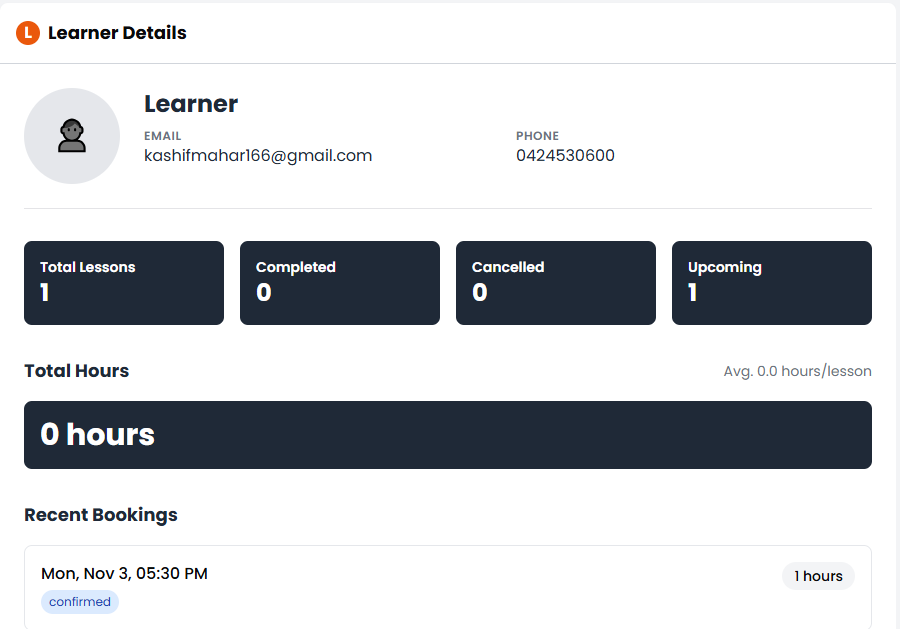 Keep track of each learner’s completed lessons and upcoming bookings for smooth management.