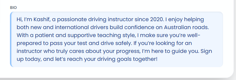 - Write a short bio highlighting your driving instruction experience, your teaching style, and any special skills.